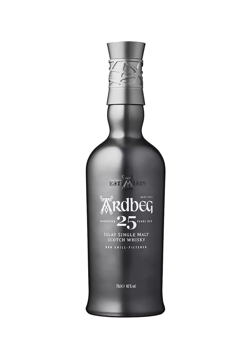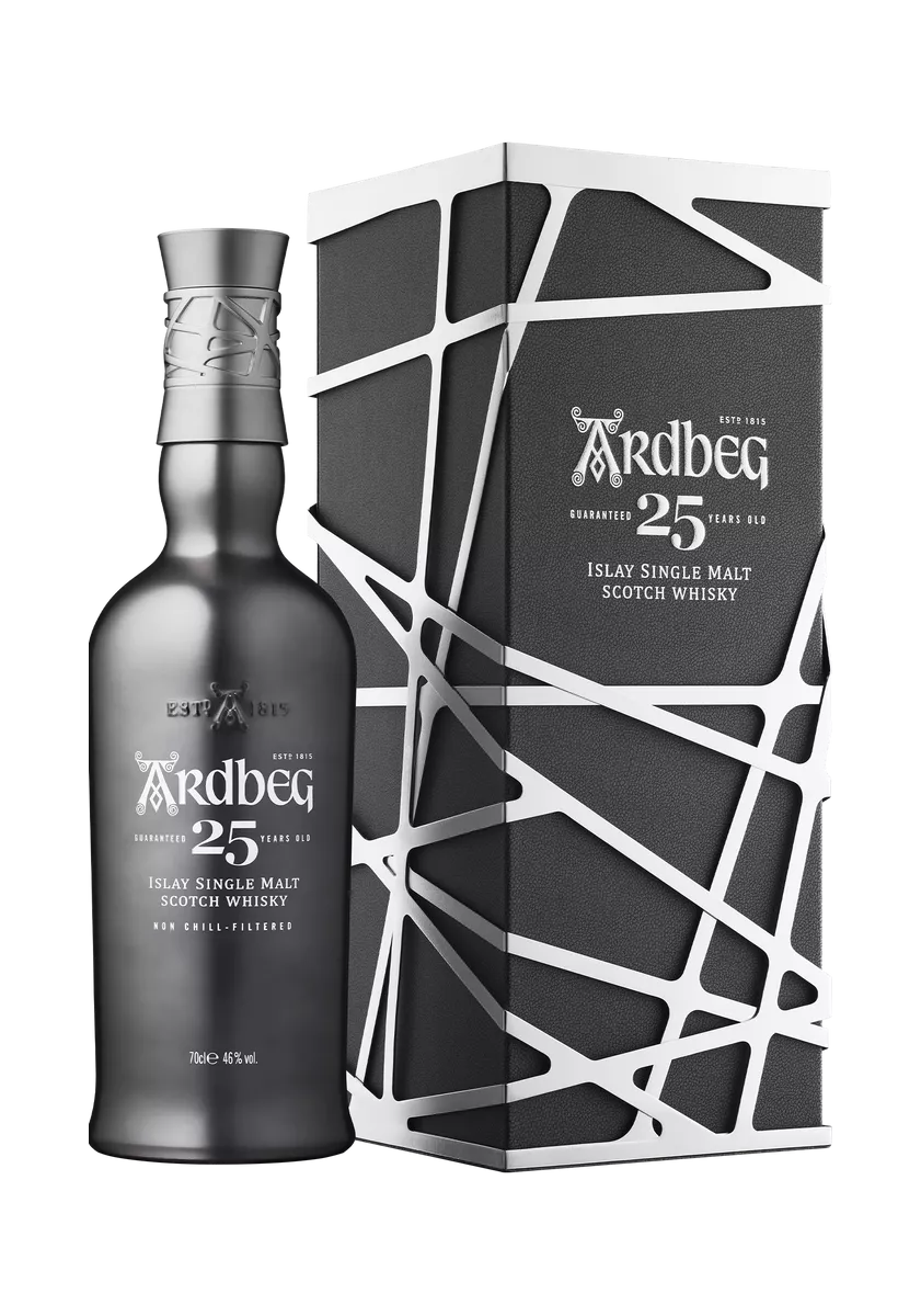 Le plus vieux whisky d’Ardbeg fait son entrée : Ardbeg 25 ans. Ce whisky a été embouteillé à partir des fûts de bourbon les plus rares des chais Ardbeg, à une époque où la distillerie vivait des heures sombres.