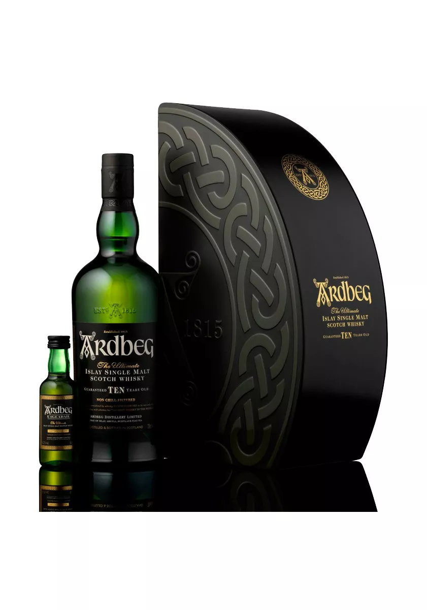 La mignonnette de Ardbeg Uigeadail, incluse dans le coffret, est un alliage de whisky vieilli en fĂ»ts de Bourbon et en fĂ»ts de XĂ©rĂšs, mariant avec dextĂ©ritĂ© le fruitĂ© caractĂ©ristique du Sherry et le tourbĂ© d’Islay.