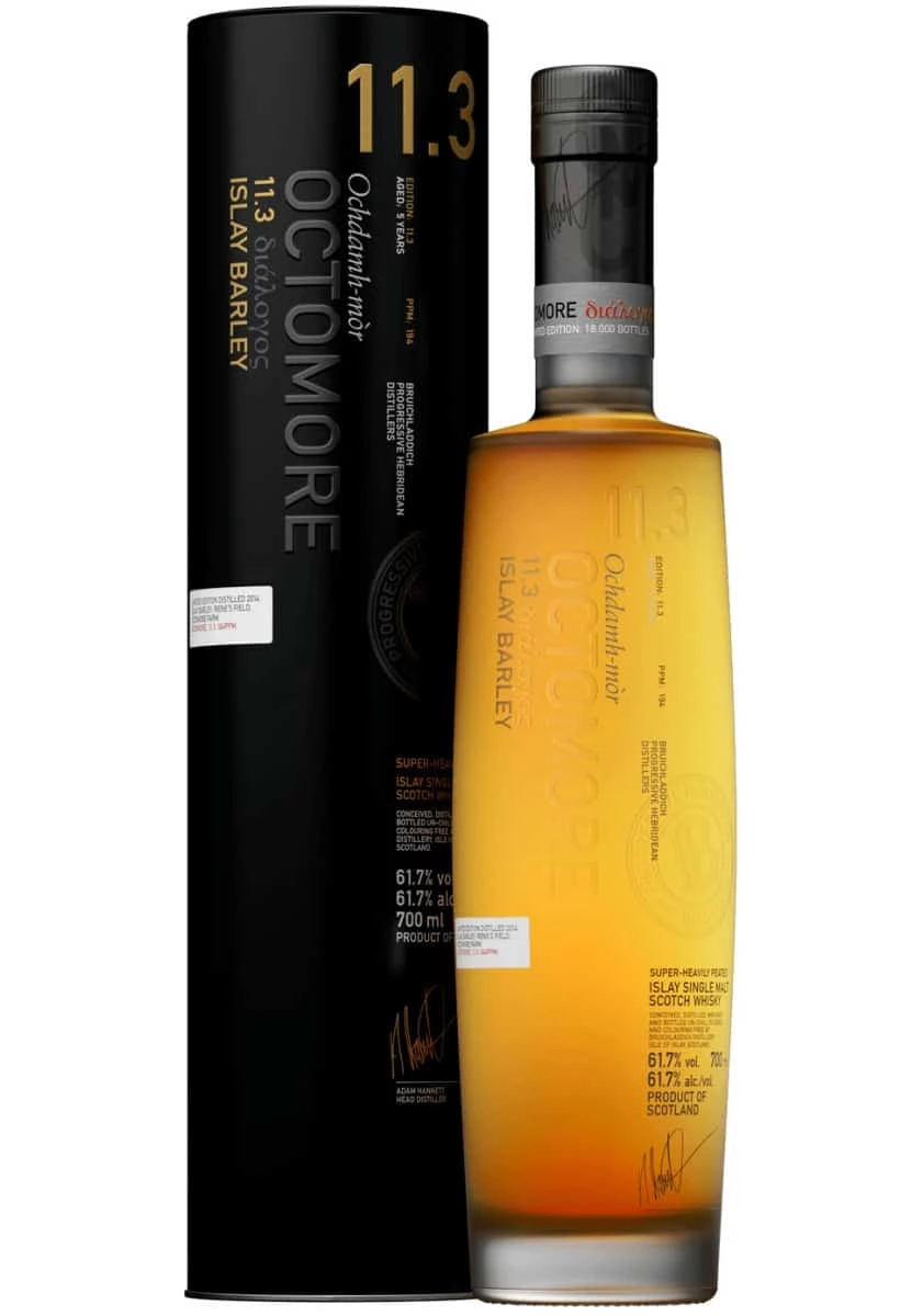 Orge 100% d’Islay de la ferme Octomore. ArĂŽmes: Tourbe, zeste de citron, chocolat iodĂ©. L’un des single malts les plus tourbĂ©s au monde (194 ppm) et entiĂšrement Ă©laborĂ© sur l’Ăźle d’Islay. MillĂ©sime 2014 puis vieilli 5 ans en fĂ»ts de whiskey amĂ©ricain de 1er remplissage. Non filtrĂ© Ă froid.