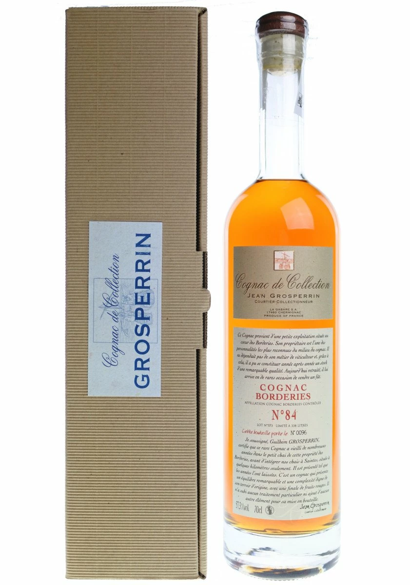Ce cognac Grosperrin N°84 Borderies non millésimé officielement (nous devinerons son année par la sugestion de son nom) provient d’une petite exploitation des Borderies. Malgré sa taille, son propriétaire est devenu l’une des personnalités les plus reconnues du milieu du cognac.